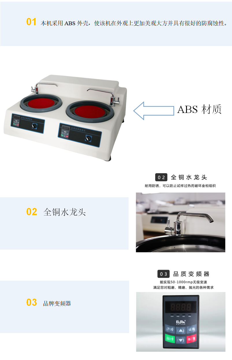 本機通過變頻器調速,可直接獲得50~1000轉/分鐘之間的轉速,從而使本機具有更加廣泛的應用性。是用戶用來制作金相試樣必不可少的設備。