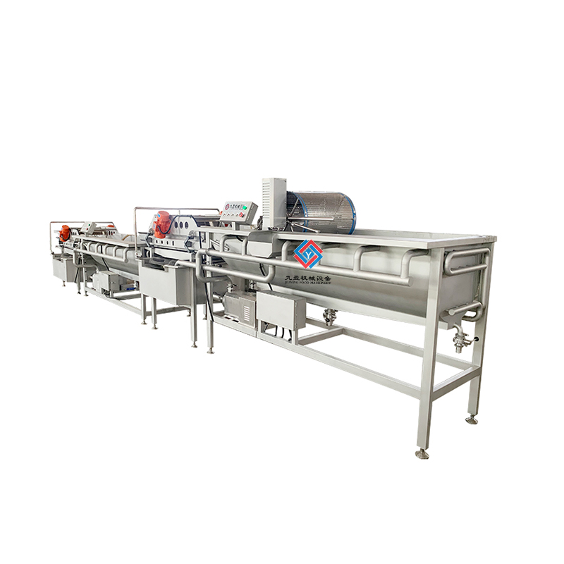 2.切割蔬菜使用到清潔機可以將材料均勻的進行分散,螺旋的水流可以將物料和雜質進行分離,物料隨水流出不會損壞物料的表面,后端采用了振動傳遞的方式并進行二次噴水,以此來提高清潔的程度,配備的臭氧裝置可以用于一次性清潔,并殺滅等農藥殘留,冰水裝置可以用于二次清潔,用來降低物料的溫度達到延長存儲的時間。